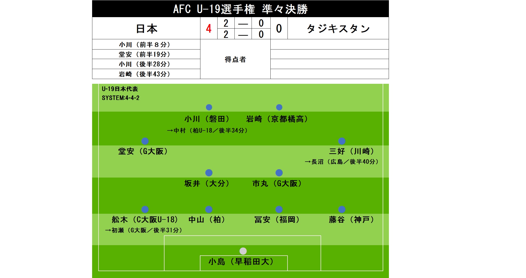 戦前の予想通り自陣に守備ブロックを固めてきたタジキスタンに対して、日本は序盤からボールを保持する流れとなった。すると前半8分、エースの小川が早速仕事をする。ハーフウェー付近やや左からのロングボールに反応したヘディングこそ右ポストに当たったものの、こぼれ球を拾ったMF堂安律(G大阪)が再びゴール前にクロスを送ると再び小川が頭でとらえる。気持ちの入った一撃は相手GKの股下を抜けて決まり、1-0と先手を取った。