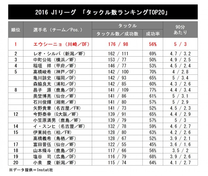 タックル数トップ20の中で、最高の成功率を叩き出したのは、鹿島のDF昌子源だ。成功率2位のヴィッセル神戸DF高橋峻希が70%なのに対して、昌子は77%と大きく上回り断トツ。タックル数自体もリーグ8位タイと多いが、局面での判断力や技術を生かし、日本代表のバヒド・ハリルホジッチ監督が求めるデュエル(1対1の強さ)の面で存在感を放った。