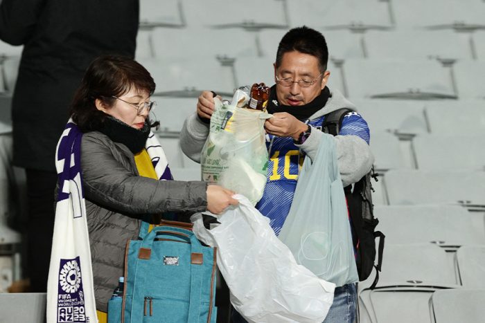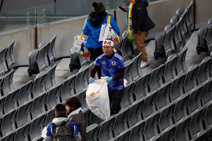 【実際の写真】スウェーデン戦後にスタンドでごみ拾いをする日本人サポーターの姿