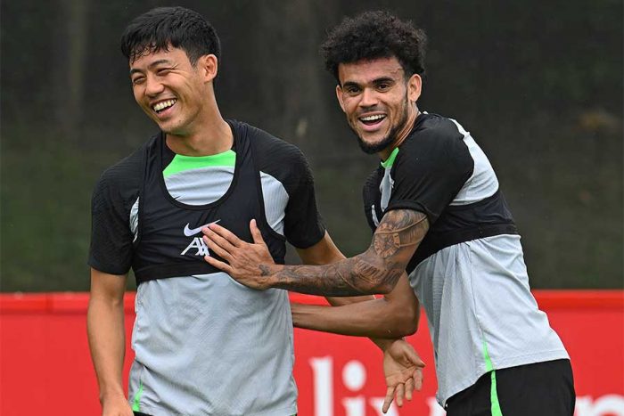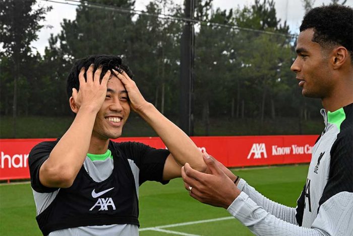 遠藤航、ガクポ&ディアスと「馴染んでる」 リバプール同僚と“微笑ましい”練習場面が話題