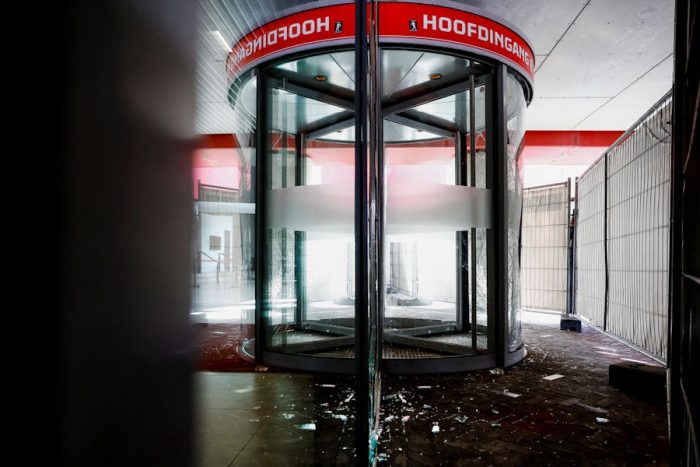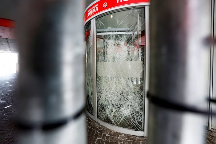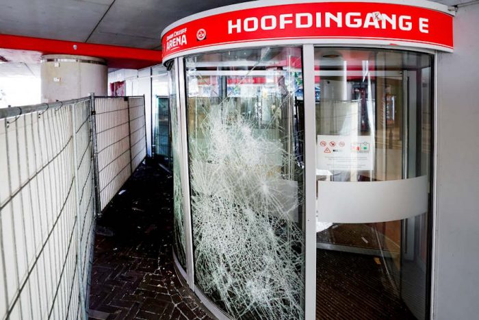 Destruction at the main entrance of Johan Cruijff Arena by the hooligans is seen after the abandoned match between Ajax and Feyenoord last Sunday in Amsterdam, Netherlands September 25, 2023. REUTERS/Piroschka van de Wouw