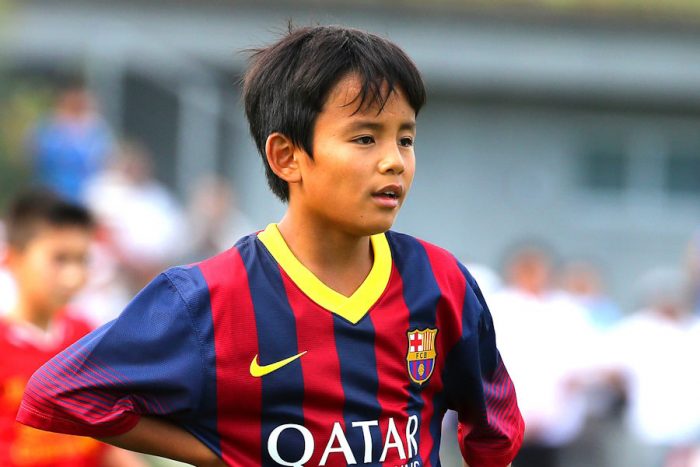 TOKYO, JAPAN – AUGUST 30: Takefusa Kubo (C) of FC Barcelona in action during the U-12 Junior Soccer World Challenge 2013 final match between FC Barcelona and Liverpool FC at Ajinomoto Stadium on August 30, 2013 in Tokyo, Japan. (Photo by Koji Watanabe/Getty Images)