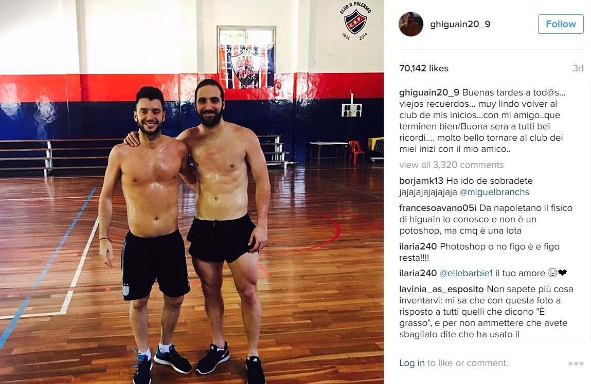 イグアインはパレルモでのトレーニング写真を掲載。「みんな、こんばんは。素晴らしい思い出だ。自分のキャリアをスタートさせたクラブで友人とトレーニングできるのは最高だ」と、メッセージとともに黒い短パン一丁で友人と肩を組む2ショット写真を掲載した。