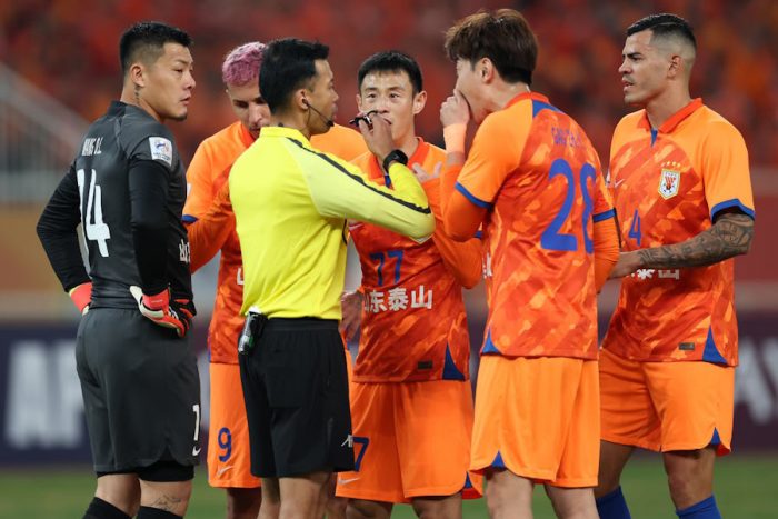 JINAN, CHINA – FEBRUARY 13: Shandong Taishan players protest to referee Muhammad Taqi as the penalty is given to Kawasaki Frontale after the VAR review during the AFC Champions League Round of 16 first leg match between Shandong Taishan and Kawasaki Frontale at Jinan Olympic Sports Center Stadium on February 13, 2024 in Jinan, China. (Photo by Fred Lee/Getty Images)