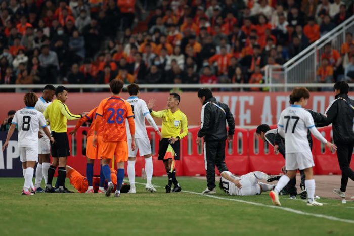 JINAN, CHINA – FEBRUARY 13: Yusuke Segawa of Kawasaki Frontale lies injured after a challenge by Peng Xinli of Shandong Taishan during the AFC Champions League Round of 16 first leg match between Shandong Taishan and Kawasaki Frontale at Jinan Olympic Sports Center Stadium on February 13, 2024 in Jinan, China. (Photo by Fred Lee/Getty Images)