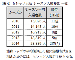 そもそもとして、セレッソ大阪は決して入場者数に秀でたクラブとは言えなかった。表4を参照してもらいたい。これを見ても分かるように、2010年にJ1に再昇格して以降、入場者数は凡庸と言っていい数字だ。