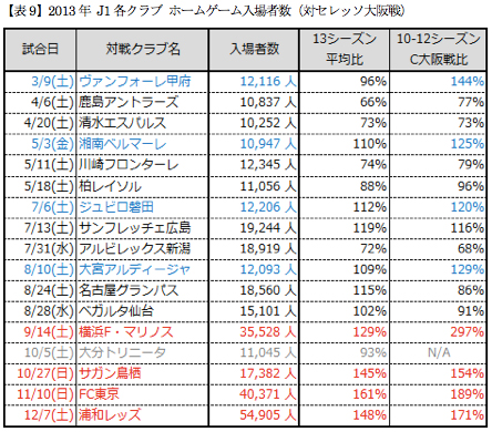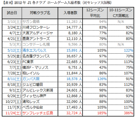 先ほどの表はセレッソ大阪のホームゲームでの入場者数であったが、今度はアウェイゲームでの入場者数である。各J1クラブがセレッソ大阪をホームに迎えた時の入場者数と、シーズン平均入場者数および過去シーズンにおけるセレッソ大阪戦の入場者数を比較したものである。