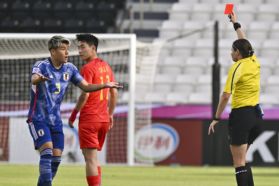 初戦の中国戦で日本は前半8分、MF山田楓喜の高精度クロスに松木が左足ボレーで合わせ、幸先良く先制した。しかし、同17分に日本をアクシデントが襲う。ボールのないところで中国MFジャ・フェイファンに背後から当たられた西尾が肘を振るような形で応戦。当初はプレーが流れたものの、ビデオ・アシスタント・レフェリー(VAR)が介入し、主審がオンフィールドレビューを実施したうえで、西尾にレッドカードが提示されてしまった。