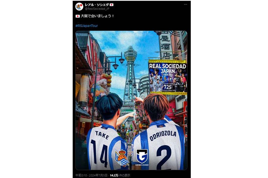今月下旬にG大阪との試合を控えるなかで、ソシエダの日本語版公式Xは「ジャパンツアー」に向けた告知画像をアップ。久保とアルバロ・オドリオソラのユニフォームを着たファンが、大阪の名所・通天閣を指差す光景が収められ、「大阪で会いましょう!」と綴っている。