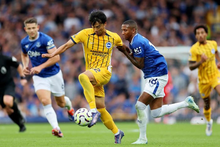 LIVERPOOL, ENGLAND – AUGUST 17: Kaoru Mitoma of Brighton & Hove Albion is fouled by Ashley Young of Everton results in a red card during the Premier League match between Everton FC and Brighton & Hove Albion FC at Goodison Park on August 17, 2024 in Liverpool, England. (Photo by Jan Kruger/Getty Images)