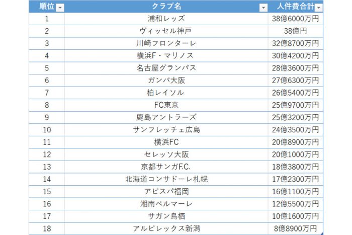 【画像】どのクラブが多く支払ってる? J1全クラブの人件費ランキング