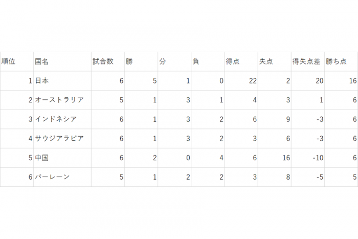 【画像】2位以下が前代未聞の混戦 豪州、サウジが苦戦…W最終予選グループCの順位表