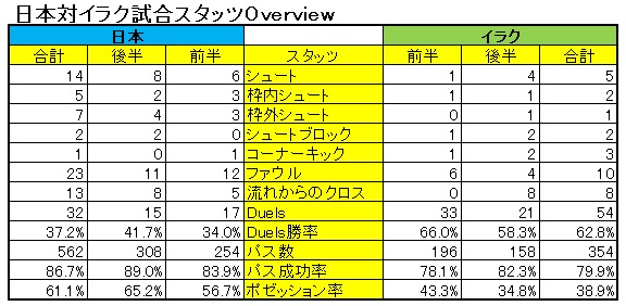アジアの強豪国の一つであるイラクを相手に60%を超えるポゼッション率で、562本のパスを86.7%の成功率で回し、14本のシュートを放った日本のサッカーは最少得失点差とはいえ十分に内容で圧倒していたと言える。クロスの数こそパレスチナ戦の27本から13本と半分以下に減ったが、味方に繋がった数は3本から6本と倍に、成功率は11%から46%と約4倍増えた。