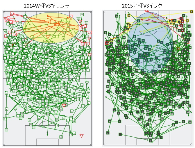 この図の左側は2014年FIFAワールドカップブラジル大会における日本対ギリシャの試合の日本代表の成功したパスの軌跡だ。退場者を出して一人少ないギリシャ代表が守りを徹底的に固めた結果、アタッキングサードのエリアでは急に消極的になりパスの軌跡が少ししか見られない。なかなか相手の危険なエリアに侵入できず、サイドから中に放り込み跳ね返されたことを示す赤い線がやけに目につく。