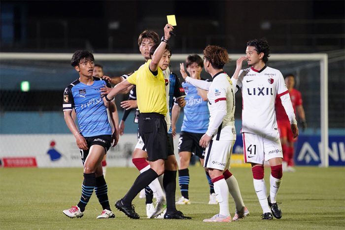 【実際の場面】激高する旗手怜央をなだめ相手にイエローカードを提示する西村雄一レフェリー