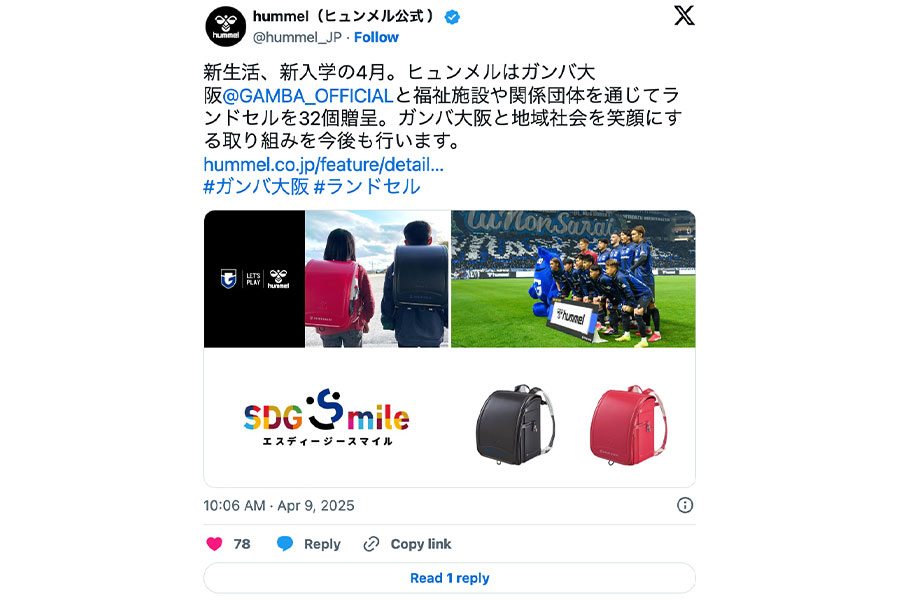 J1ガンバ大阪が4月6日、福祉施設や関係団体を通じて32個のランドセルを子供たちに贈呈したことを報告した。2023年からオフィシャルサプライヤー契約を締結した「hummel(ヒュンメル)」と共同で行われた。