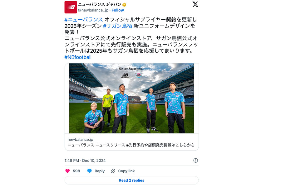 「今季『金継ぎ』をデザインテーマにグラフィックが表現されています。ニューバランスの共通デザインテーマ『風車』がジャガード編みで入っているのですが、この不規則な編みが表面の『金継ぎグラフィック』と相まってランダムで現代風な雰囲気を醸し出しています」と、ともさんは評している。ファンからも「めっちゃかっこいい」「お洒落」とコメントが寄せられ、新しくなった1着を身に纏い1年でのJ1昇格を目指す。