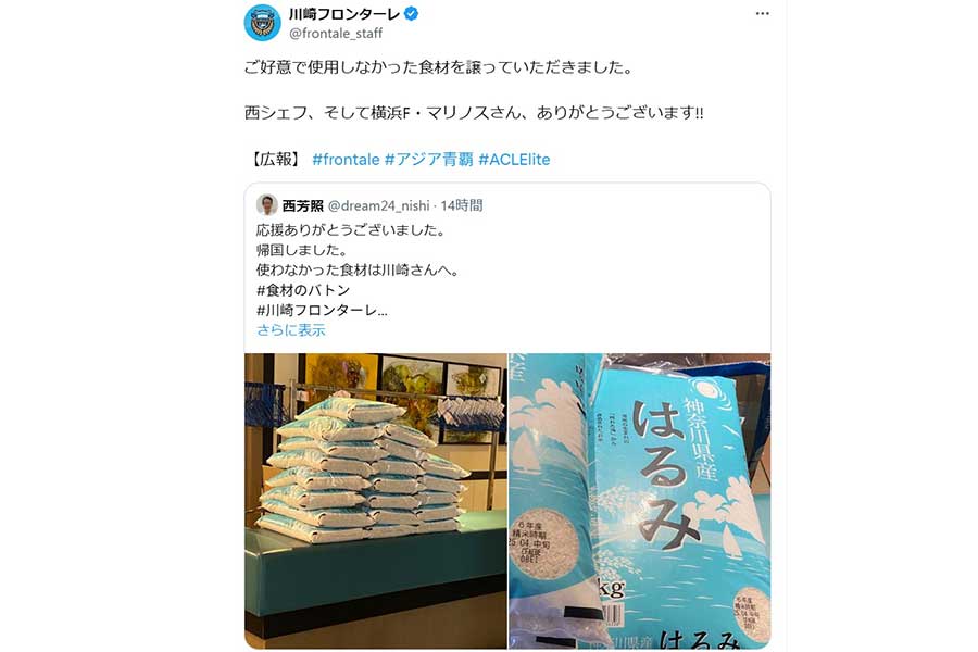 アジア・チャンピオンズリーグエリートの準決勝に進出した川崎フロンターレは現地時間4月28日、クラブの公式Xを更新し、準々決勝で敗退した横浜F・マリノスから食材を提供されたことを報告した。