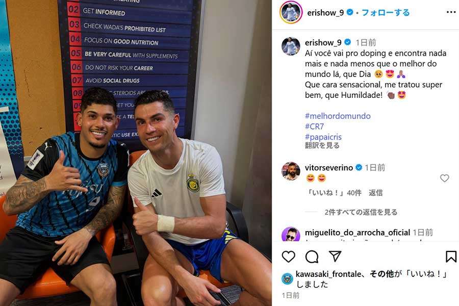 J1川崎フロンターレは現地4月30日に行われたAFCチャンピオンズリーグエリート(ACLE)の準決勝でアル・ナスル(サウジアラビア)に3-2で競り勝った。試合後には川崎FWエリソンが自身のSNSにアル・ナスルでプレーするポルトガル代表FWクリスティアーノ・ロナウドと遭遇した場面を公開し、その際の対応に「人格者すぎて参りました」と話題を呼んでいる。