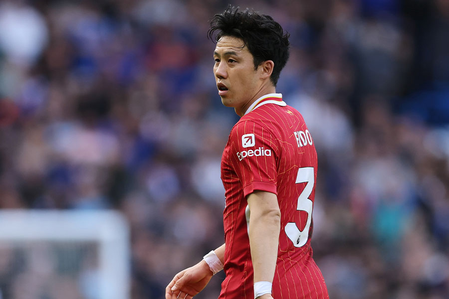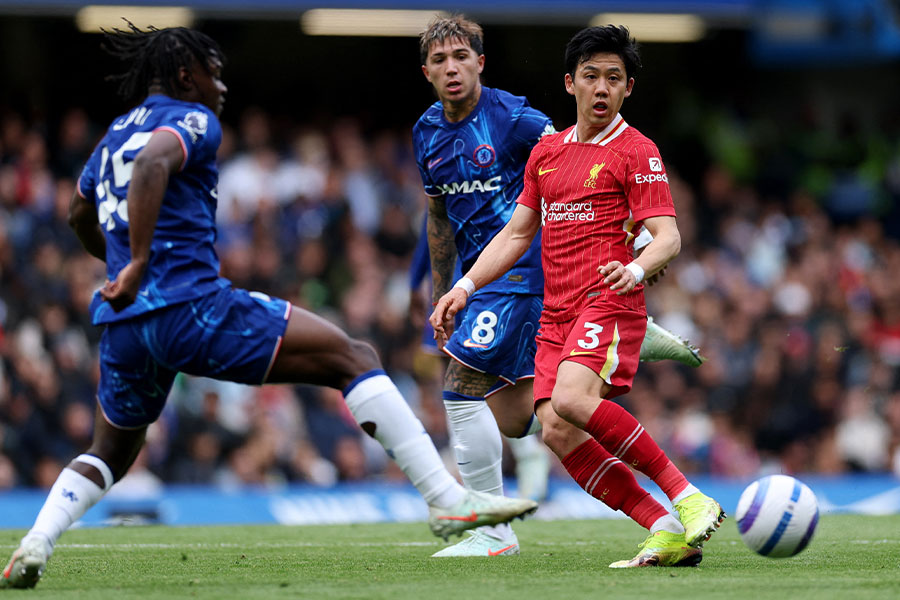 ついに訪れた、今季リーグ戦初先発。リバプールの遠藤航は、5月4日の第35節チェルシー戦でスタメンに名を連ねた。アルネ・スロット新体制下では、クローザーとしての途中出場に留まっていた遠藤。チームのプレミア優勝が決まった前節トッテナム戦(5-1)などは、右サイドバック(SB)としての投入だった。だがこの日は、本来の中盤中央でキックオフを迎える機会を与えられた。