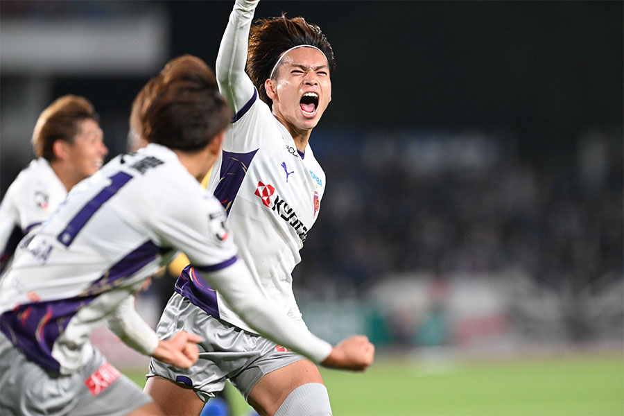 歓喜の瞬間、実に6人もの京都の選手が町田のペナルティーエリア内にいた。途中出場のMF奥川雅也、MF川﨑颯太、FW長沢駿、FW平賀大空の4人に、サイドバックで先発し、3バックに移行した後半36分以降はウイングバックとして上下動を繰り返していた左の須貝英大、そして右の福田だ。