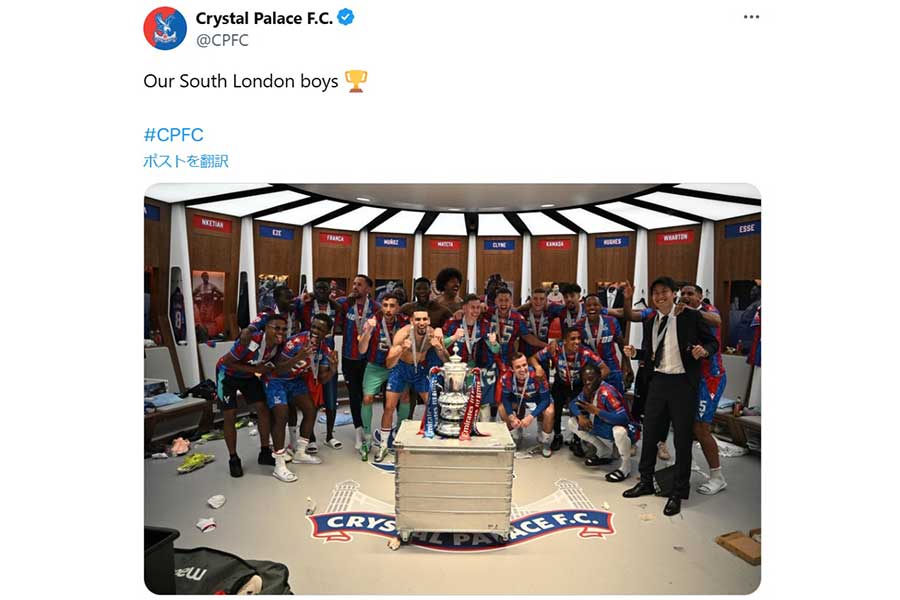 イングランド1部クリスタル・パレスは現地時間5月17日、FAカップ決勝でマンチェスター・シティを1-0で下し、初優勝を飾った。タイトル獲得後のロッカールームでは、歓喜に浸る選手のなかで一人だけスーツ姿だった日本代表MF鎌田大地の姿が反響を呼んでいる。