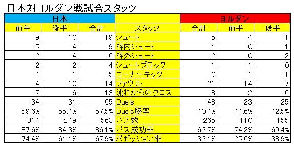 日本対ヨルダン戦の表を見てほしい。前半の日本のポゼッション率は74.4%、つまり試合時間の3/4を支配していたことになる。試合を通したアクチュアルタイム(リスタート等を除いた実質試合時間)はアジアでの大会は50分前後のため、前半だけ見ると25分の3/4、つまり約19分は日本のボールだ。相手ボールの時の約6分間だけ相手のイニシアチブで進められるが、パスの成功率60%強という技術の低いチーム相手の守備はさほど負担にならない。逆に相手は移動を伴い時差に悩む上に前半からこれだけの負荷をかけられたため、それを後半跳ね返すにはかなりの力が必要な状況だった。
