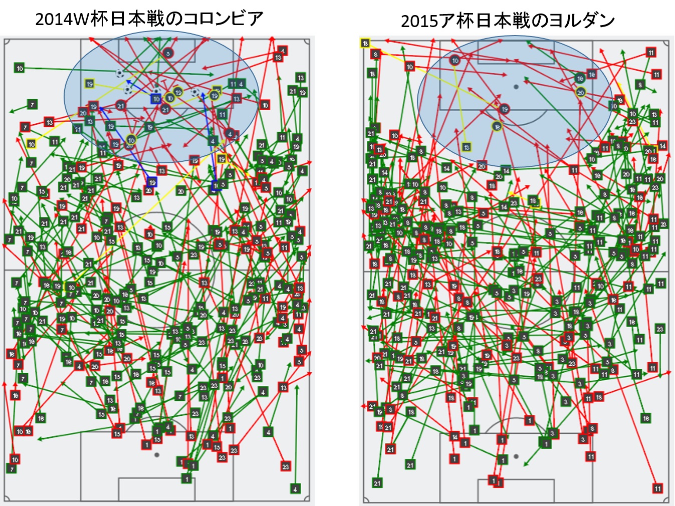 最後のイラストは左がW杯の日本戦におけるコロンビア、右がヨルダンのパスとシュートの軌跡だ。