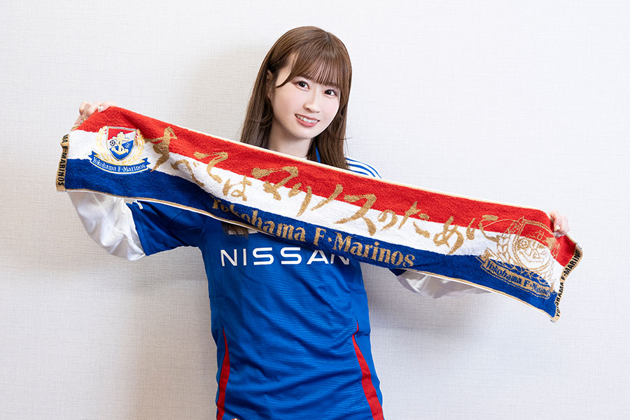 「その少し前(24年5月)にF・マリノスはACL(AFCチャンピオンズリーグ)で決勝を戦いました。私はキャプテンの喜田(拓也)選手を尊敬しているんですけど、(チーム密着)ドキュメンタリーで喜田選手がチームにかける熱い言葉を聞いて、サッカー選手とアイドル、職業こそ違えど、自分と重なる部分を感じました。『サッカー選手もこうやって悩むんだ』『チームを支える存在がいるんだ』と知って、もっと応援したいという気持ちが強くなったんです。だから、夏フェスの出番を終えて汗びしょびしょ、ボロボロになったあとでも、(F・マリノス)のユニフォームに着替えて、タクシーに飛び乗って、日産スタジアムに向かいました。会場についたのは試合残り15分くらいでしたけど(笑)。日産スタジアムに行くと気持ちが上がるというか楽しいし、『ここが自分のホームだ』という感覚に近い気持ちを抱くようになりました」