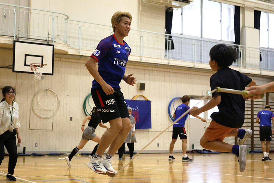 J1・FC東京の選手たちが7月1日、都内の小学校を訪問した。DF木本恭生、MF小泉慶、MF俵積田晃太の3人は府中市立新町小学校を訪れ、生徒たちと大縄跳びやPK対決などを行った。