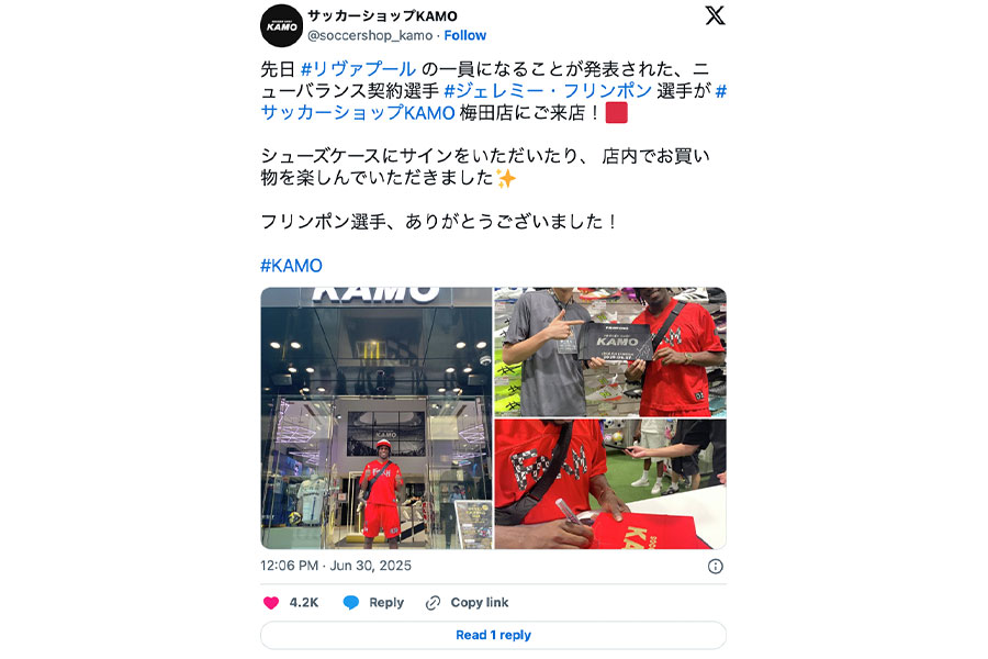 そんなフリンポンは現在、日本を訪れているようでサッカーショップKAMOが公式「X」で梅田店に来店した様子を投稿した。「シューズケースにサインをいただいたり、 店内でお買い物を楽しんでいただきました フリンポン選手、ありがとうございました!」と、声明を出している。ファンからも「親日家なの?」「まさかの本物」「会いたかった」「すごー!梅田に現れているー!」「大阪に来てたんだ!」「えー!さすがにえぐい!」「マジかよ!」と、さまざまなコメントが寄せられている。