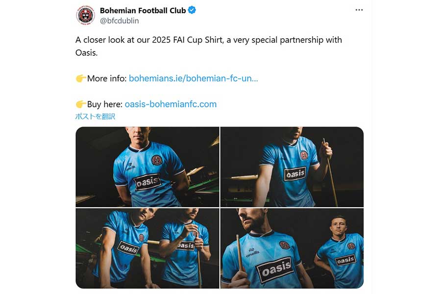 アイルランド1部ボヘミアンFCは7月1日、FAIカップ(国内カップ)用のユニフォームを発表。胸スポンサーとして世界的ロックバンドのオアシスとパートナーシップを結んだことが大きな話題を呼んでいる。