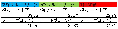 表を見ていただきたい。今回のアジアカップでの枠内シュート率は40%弱だ。ワールドカップでは簡単に枠に飛ばすシュートは打たせてくれない。その率は約13%下がる。ペナルティエリア内で必死に体に当ててシュートを止めようと試みるプレーの結果がシュートブロック率だ。グループリーグで20%弱だったデータがワールドカップでは約倍になる。