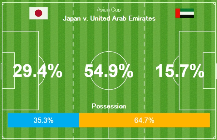 イラストを見てほしい。日本のディフェンシブサードで(ピッチを縦方向に三分割し、日本の自陣に最も近いエリアを指す)3割弱のプレーが行われていた。考えられるのは日本の立ち上がりが非常に悪かった、あるいはUAEがグループリーグで見せた平均ポゼッション率60%超えはまぐれでなく実力だったということだ。答えはおそらくこの両方だろう。