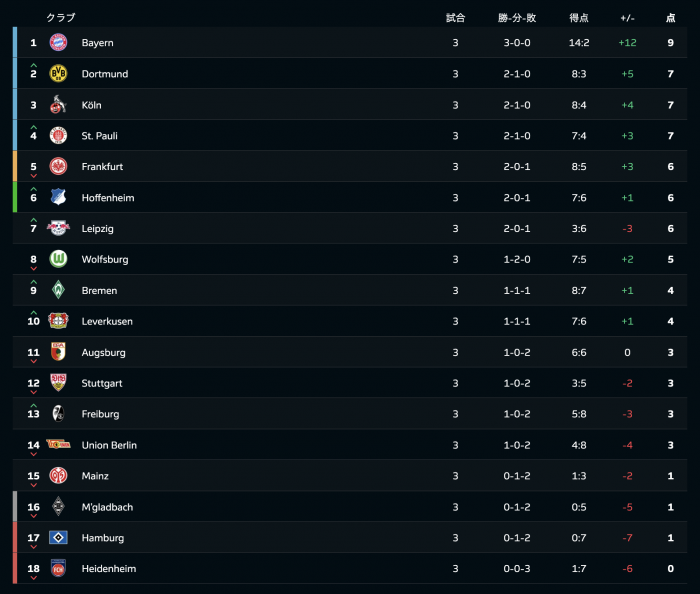 【一覧リスト】ボルシアMGは浮上できるか…ブンデスリーガの最新順位表