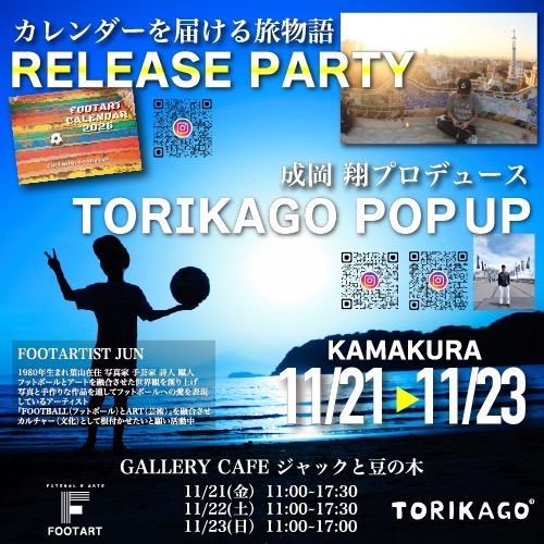 JUNさんと成岡氏は、コロナ禍の2020年ごろにSNSで知り合い意気投合。JUNさんは「FOOTBALL」と「ART」を融合させ、「FOOTART(フットアート)」をカルチャーとして根付かせるべく、日本各地で多様な活動を行っている。家族間でも親交は深く、サッカーへの熱で共感する部分が多く、話も盛り上がる。11月21日から23日にかけては、2人が中心でポップアップストアを開き、「TORIKAGO」を普及するイベントを行う。