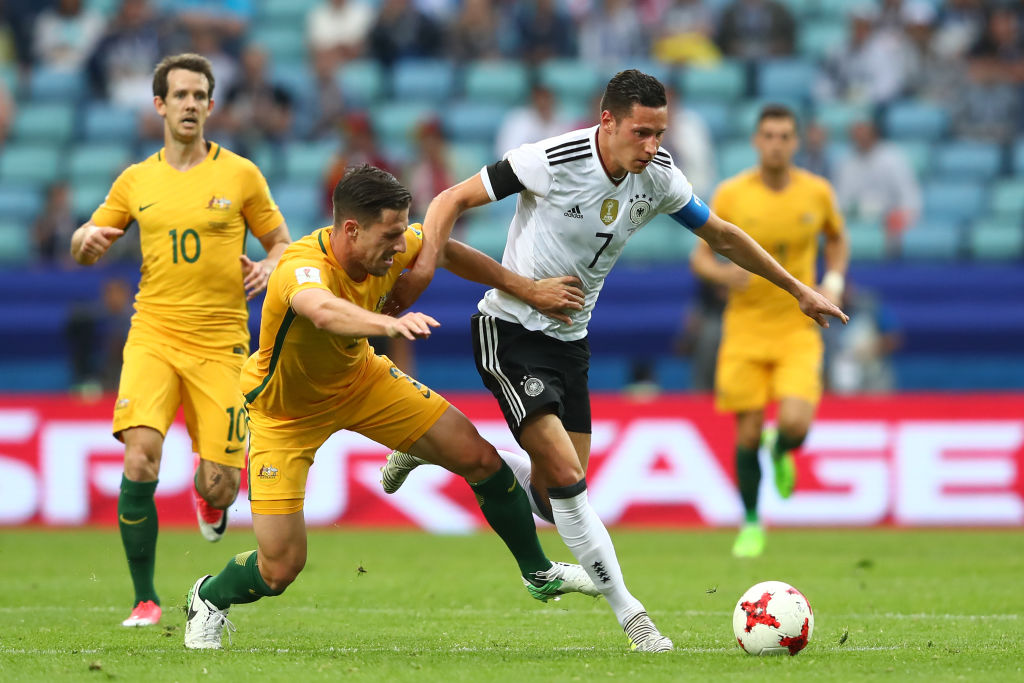 試合は前半5分、ドイツのMFブラントが右サイドを突破してゴール前に中央に送り込むと、フリーとなったMFシュティンドルが先制点をゲット。その後もドイツが押す展開となるなか、同40分にオーストラリアのMFロギッチが痛烈な左足ダイレクトシュートで1-1の同点に追いついた。