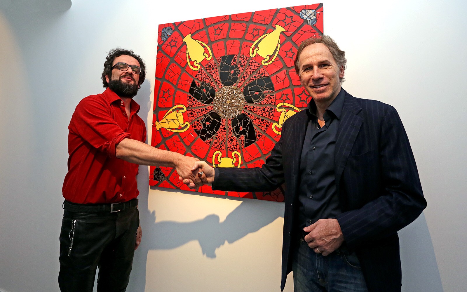 アーティストのデ・オロ氏(右)と握手する元イタリア代表のバレージ氏(右)