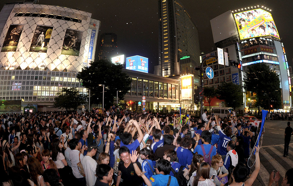 警察官が大量に動員され、交通整理に当たるなか、オーストラリア戦の終了後からスクランブル交差点には日本代表のユニフォーム姿の人びとが増えていった。そして歩行者用の信号が青になるたびに、行き交うサポーターが歓喜のハイタッチを繰り返す。混乱を避けるため、スクランブル交差点は一時、斜め横断が禁止された。
