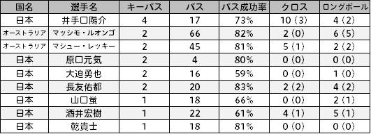 パスでつなぐオーストラリアに対し、日本の狙いは相手3バックの両脇や裏と明確だった。 試合内でのキーパスは井手口がダントツの数値を叩き出し、クロスやロングボールも多用していたことが分かる。奪ってからいかに素早く相手陣内へと入り込み、得点チャンスを窺っていたかが分かる。