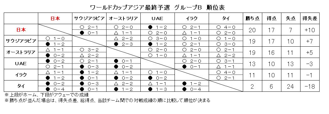 だが日本は体力の消耗から攻撃の精度を上げることができず、このまま0-1で敗戦。サウジアラビアは勝ち点を19に伸ばし、この試合前にタイを2-1で破っていたオーストラリアと並んだが、得失点差で上回って2位を確定させて本大会への切符を手に入れた。また、3位オーストラリアはグループA3位のシリアとプレーオフを行い、勝者が北中米カリブ海地区の4位と大陸間プレーオフを行う。