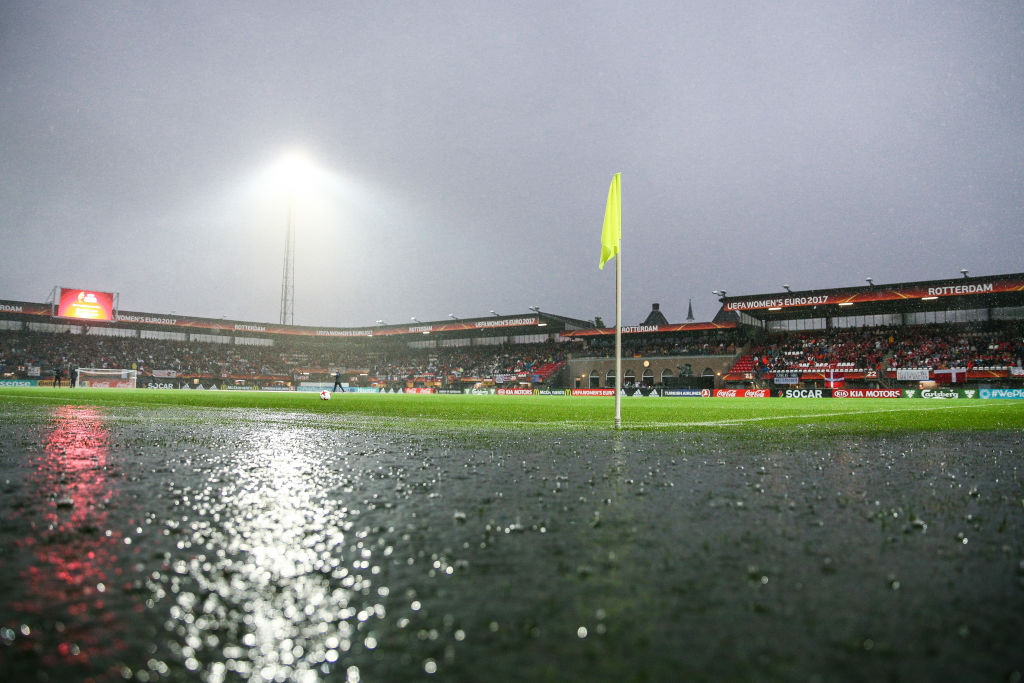 試合前から降り続いた大雨の影響でピッチは水浸しとなり、一部のラインは消えかかって見えにくく、至るところに水溜まりがあるなかでキックオフとなった。両チームとも思うようにパスが通らず、すぐにボールが止まってしまうなど苦戦を強いられるなか、互いに浮き球のボールで打開を図る。