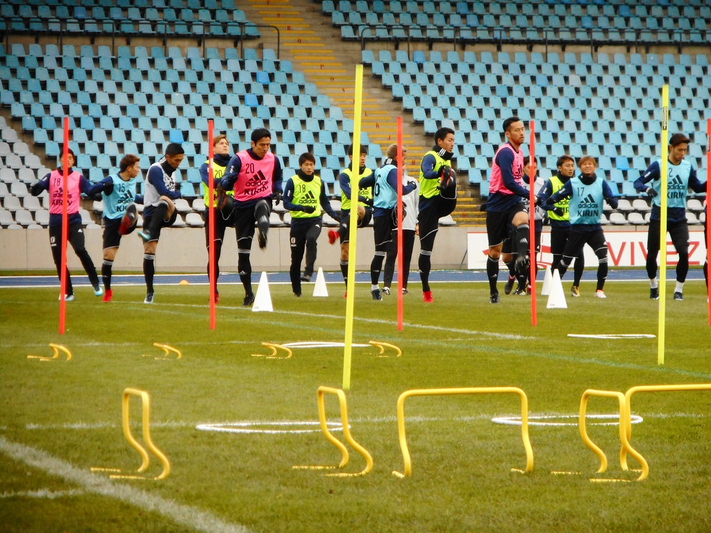 8日のトレーニングは冒頭30分以上が公開された。選手たちは軽いパス回しで体をほぐしてウォーミングアップすると、ハリルホジッチ監督が号令をかけて選手を集め、約2分の軽いミーティングを実施。直後にGK3人を除くフィールドプレーヤー22人が4組に分かれて別色のビブスを着用し、まずはサーキットトレーニングを行った。