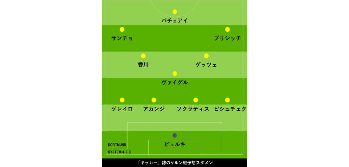 ドルトムントはGKロマン・ビュルキを筆頭に最終ラインは右からDFウカシュ・ピシュチェク、ソクラティス・パパスタソプーロス、マヌエル・アカンジ、ラファエル・ゲレイロの4バック。中盤はMFマリオ・ゲッツェ、ユリアン・ヴァイグル、香川のトライアングルとなり、3トップは右からFWクリスティアン・プリシッチ、ミシー・バチュアイ、ジェイドン・サンチョという並びが予想されている。