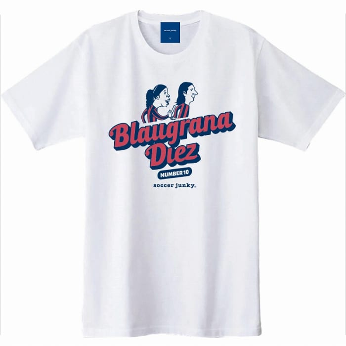 スポーツブランド「Soccer Junky(サッカージャンキー)」では、3月から“10の継承”をテーマとした半袖Tシャツを販売する。人気イラストレーター・JERRY氏とのコラボ商品で、「Blaugrana Diez」の文字とともに二人の名手がプリントされた一枚。ホワイト、ネイビー、グレーの3色を展開します。