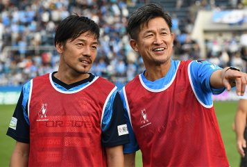 般若プリントのシャツ着用 松井大輔がレジェンドストライカー2人と“鬼ヶ島3ショット”披露